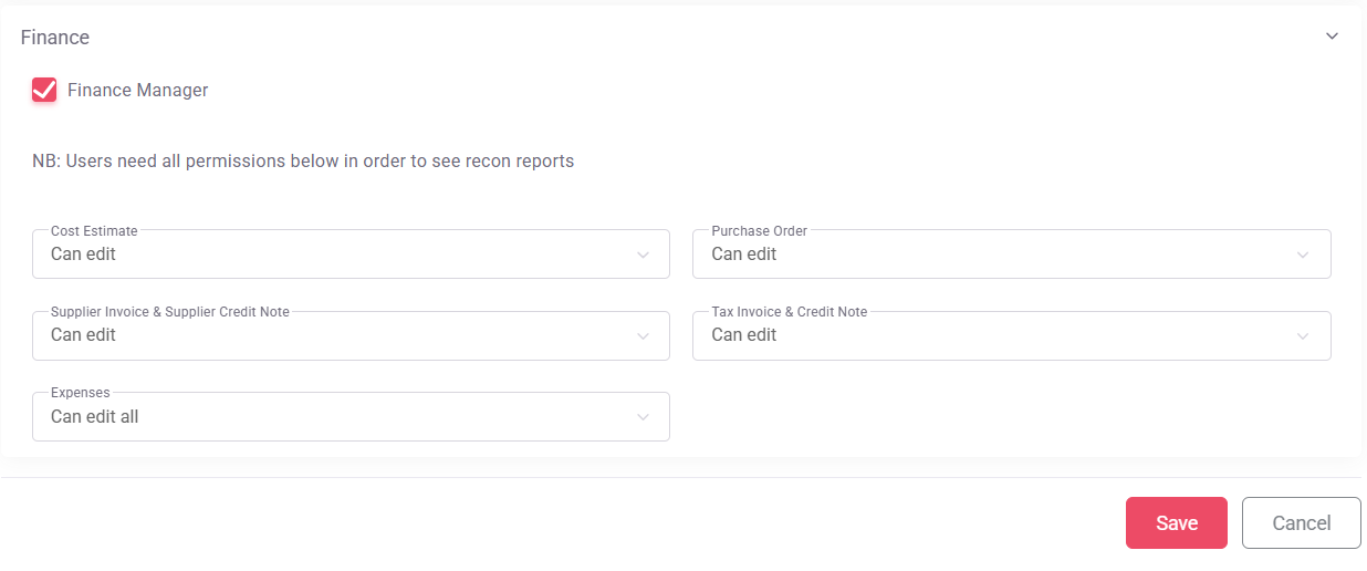 Making someone a finance manager gives them the following permissions: