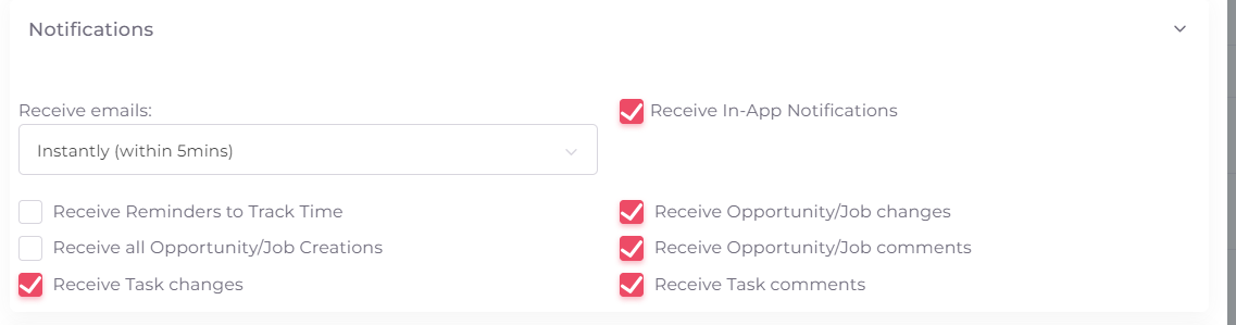 - Decide what notifications they receive and how often they receive it. Users will, by default, receive a digest summary via email of all activity that affects them within 5 minutes of the activity happening. This may be too regular and an hourly summary may be preferred. It is suggested to use the in-app notifications if you want to get notifications quickly.